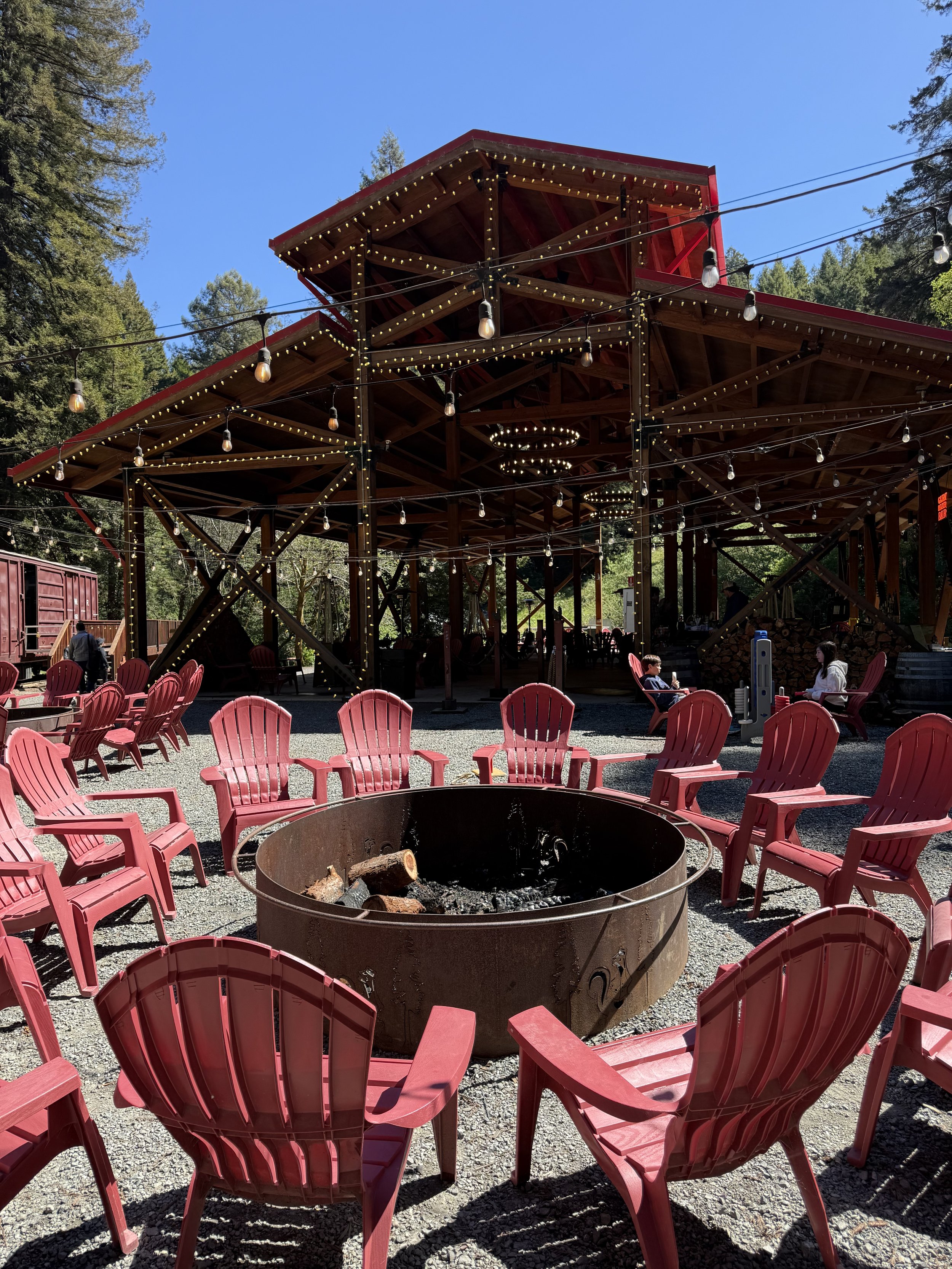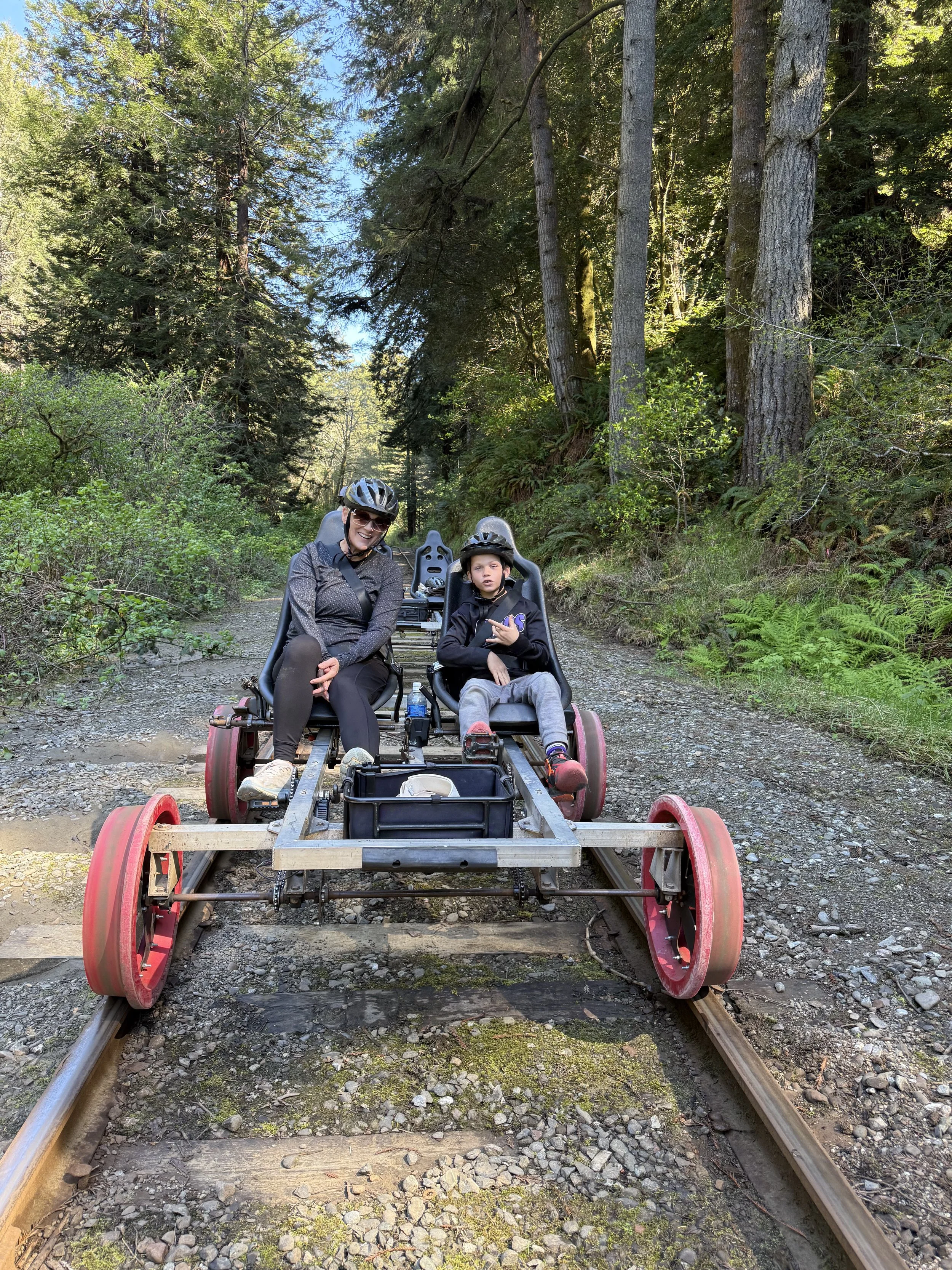 - Skunk Train (5 minutes away from Glass Beach) Cruise along historic tracks, soak in the forest views and make it an adventure the whole crew will remember. This is one of those Fort Bragg experiences you don’t want to miss! They offer 4 different rail bike routes, we did the Pudding Creek Route. It’s about a 30 minute ride along scenic Pudding Creek, over wooden trestle bridges to a hidden bar tucked back under the towering red woods. You’ll have a 50-minute layover there where you can go on a short hike, explore the creek, play yard games or sit back, relax and enjoy the fireplaces. Then you’ll pedal back 30 minutes back to the train station. They have dog trailers available. If rail biking isn’t your speed, there are plenty of train rides they offer too that also take you to this hidden spot in the woods.