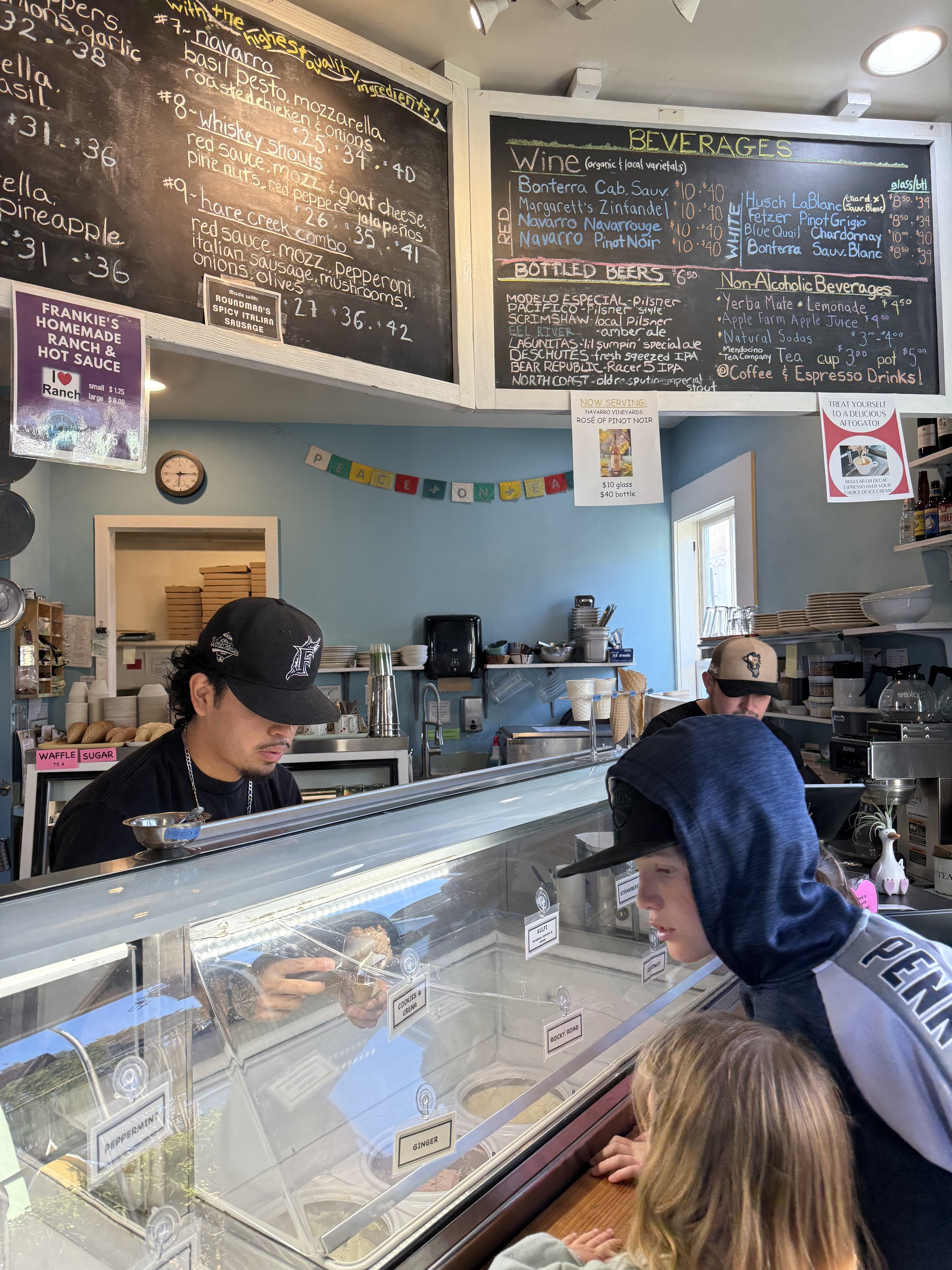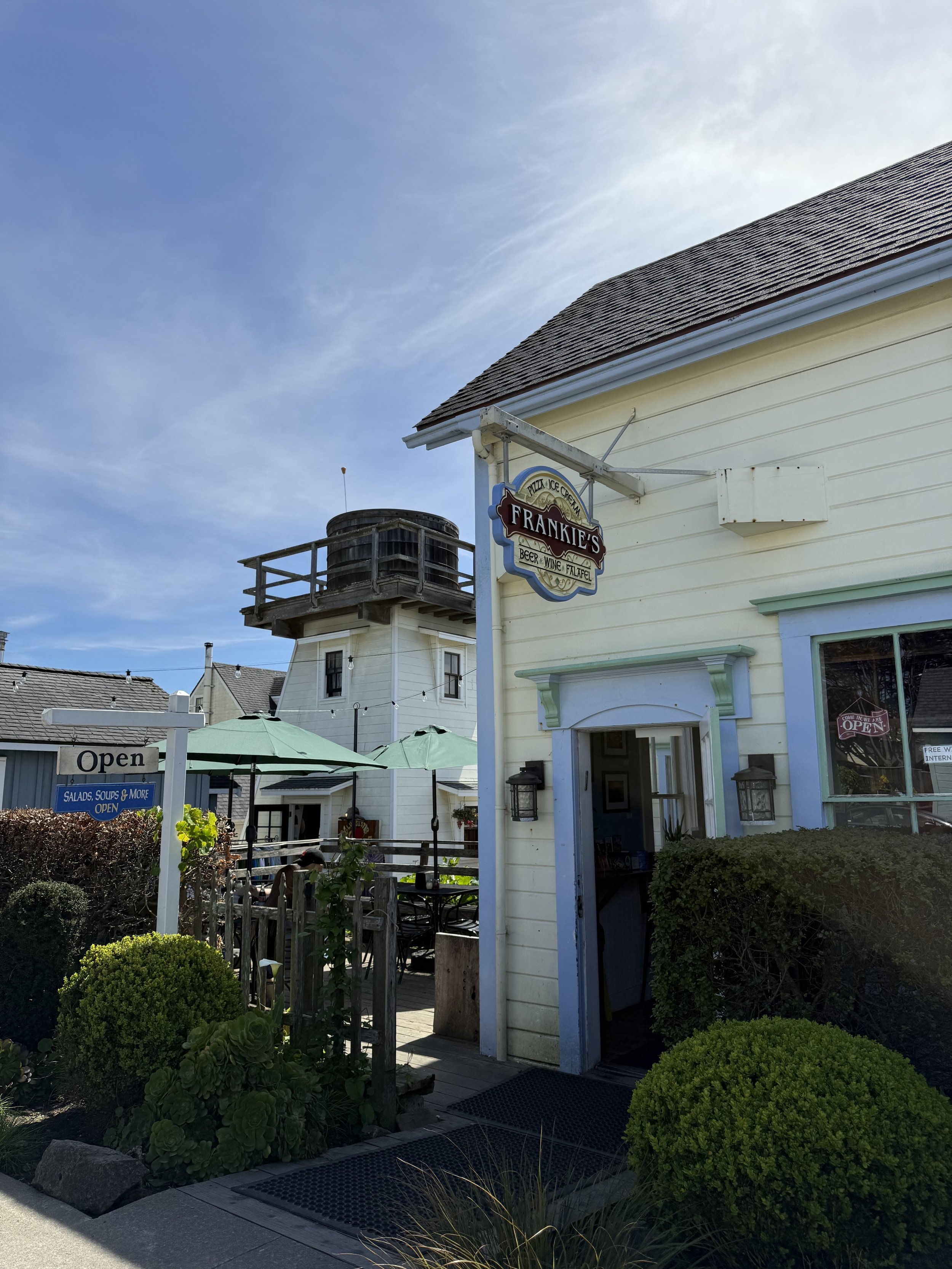 - Dinner & ice cream at Frankie’s in Downtown Mendocino (open 11:00-8:00) dog-friendly patio. A charming, family-owned pizzeria. Serving the deliciously famous Cow Lick’s Ice Cream locally sourced in Fort Bragg.